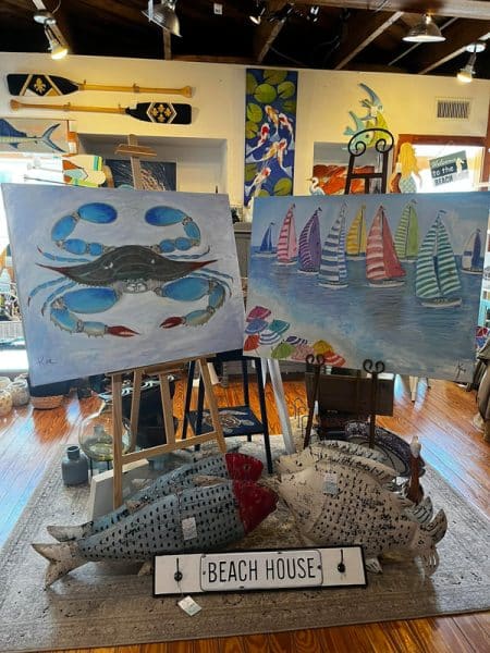 Original art with a beach flair, including paintings, prints, furniture, oars, home decor.ย
