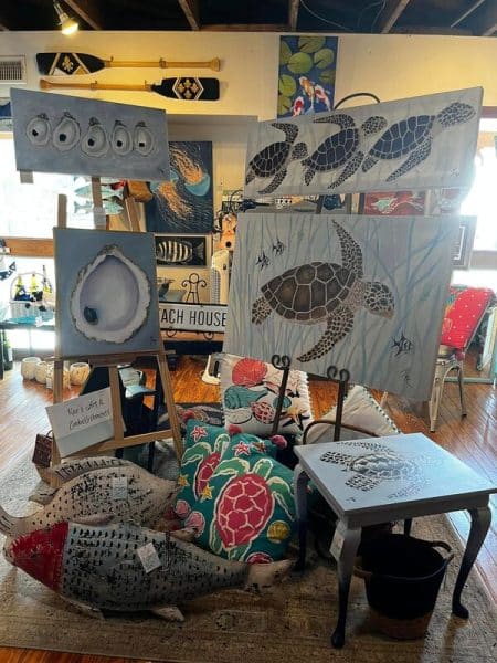 Original art with a beach flair, including paintings, prints, furniture, oars, home decor. โ