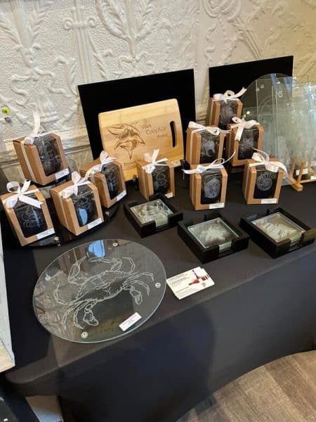 Custom etched & unique gifts such as wind chimes, cigar box purses, local art and more.